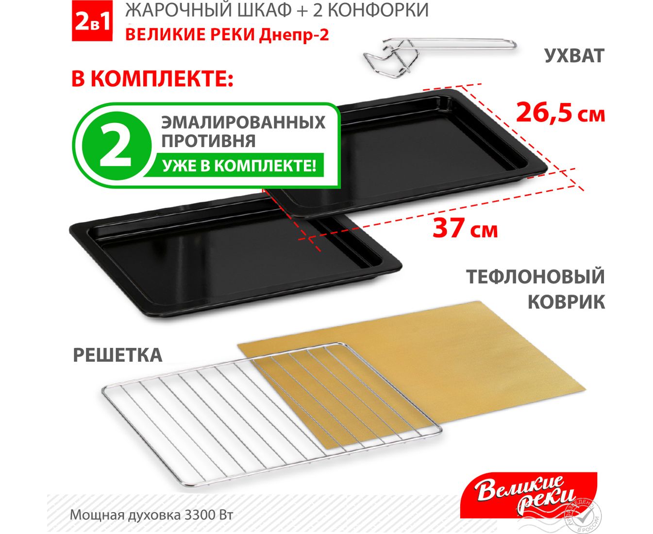 Жарочный шкаф 2 эмалированных противня, решетка для гриль-блюд, тефлоновый коврик для выпечки, ухват